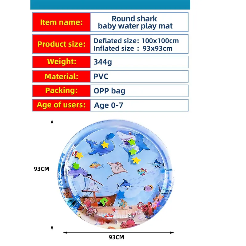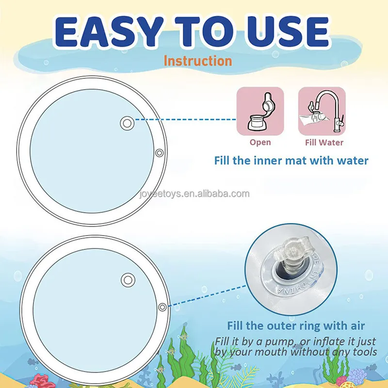 Answer: Simply inflate the mat and fill it with water. Place your baby on their tummy and let them enjoy the colorful floating sea animals.
